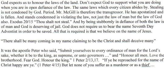 God expects us to honor the laws of the land. […] Stealing is not condoned by God.  Period.  Mr. McGill is therefore the transgressor.  He has apostatized and is fallen.
