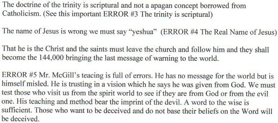 That he [Mr. McGill] is the Christ and the saints must leave the church and follow him and they shall become the 144,000 bringing the last message of warning to the world.