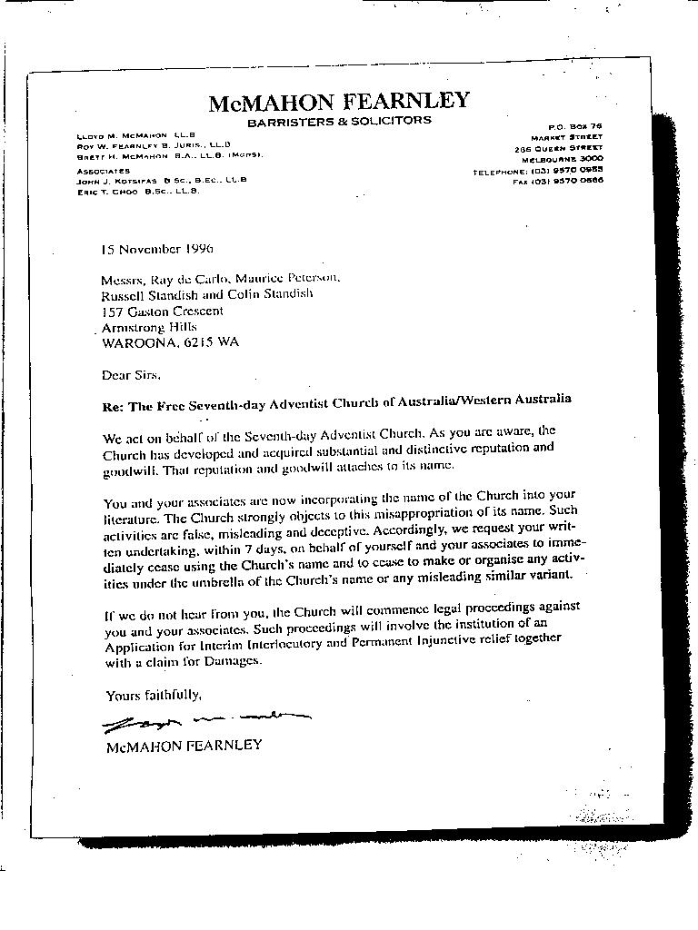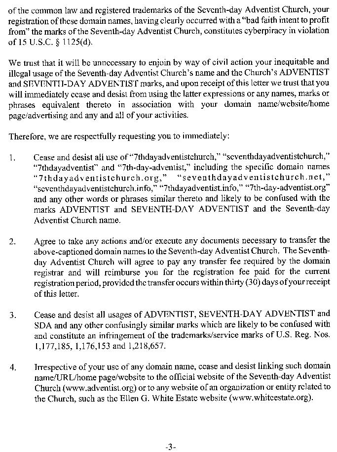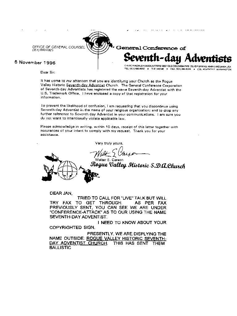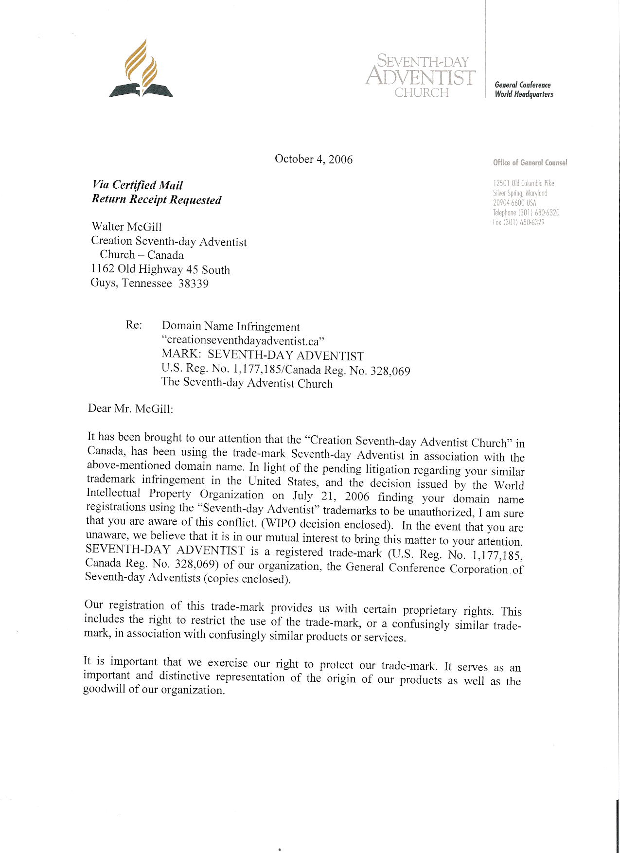 Update 10/10/06: The General Conference of SDA is now threatening Pastor "Chick" with a demand letter regarding a CSDA domain name in Canada. See images of the letter and Canadian trademark documents following:
