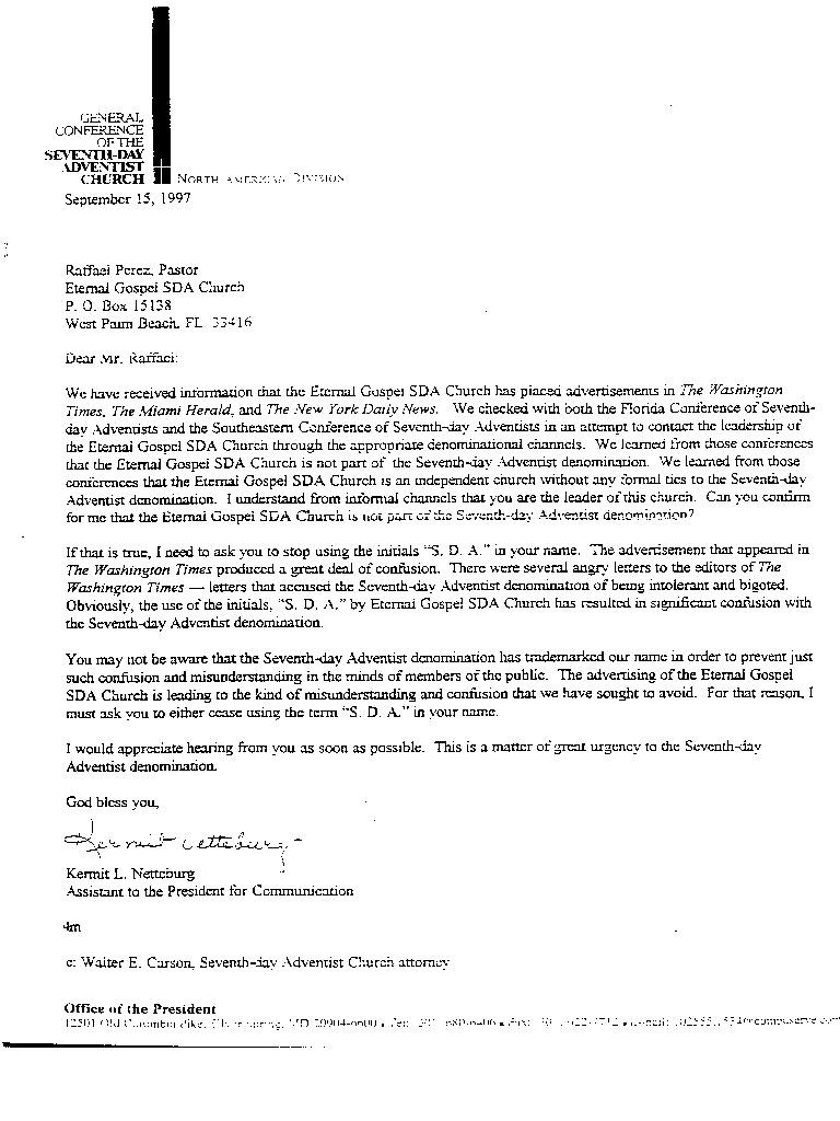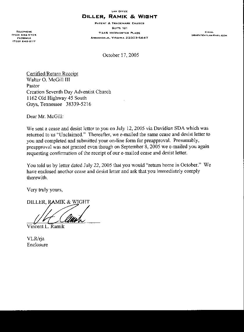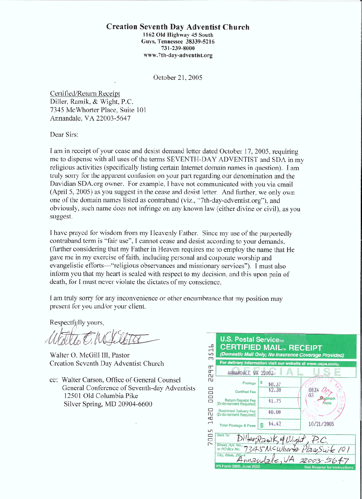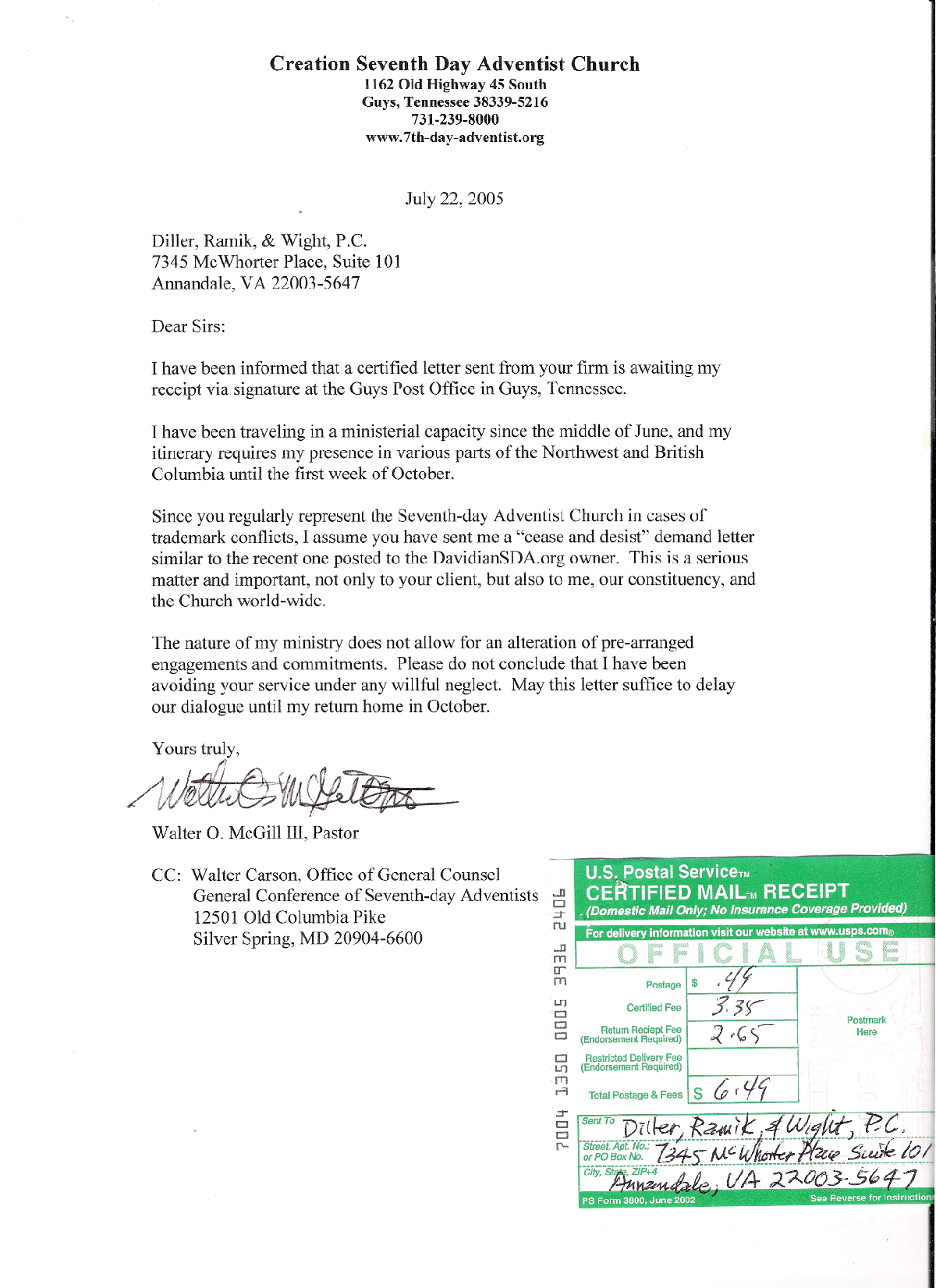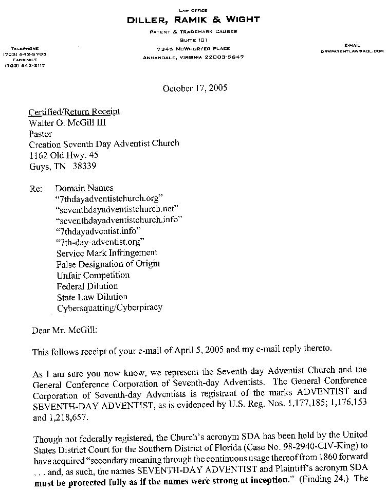 Update 07/22/05: Pastor Walter "Chick" McGill has drafted a letter to the lawfirm being used by the General Conference to enforce the Trademark asking for their understanding in the delay of his receiving the letter, as he is away currently on an evangelistic mission. The Letter may be read HERE.