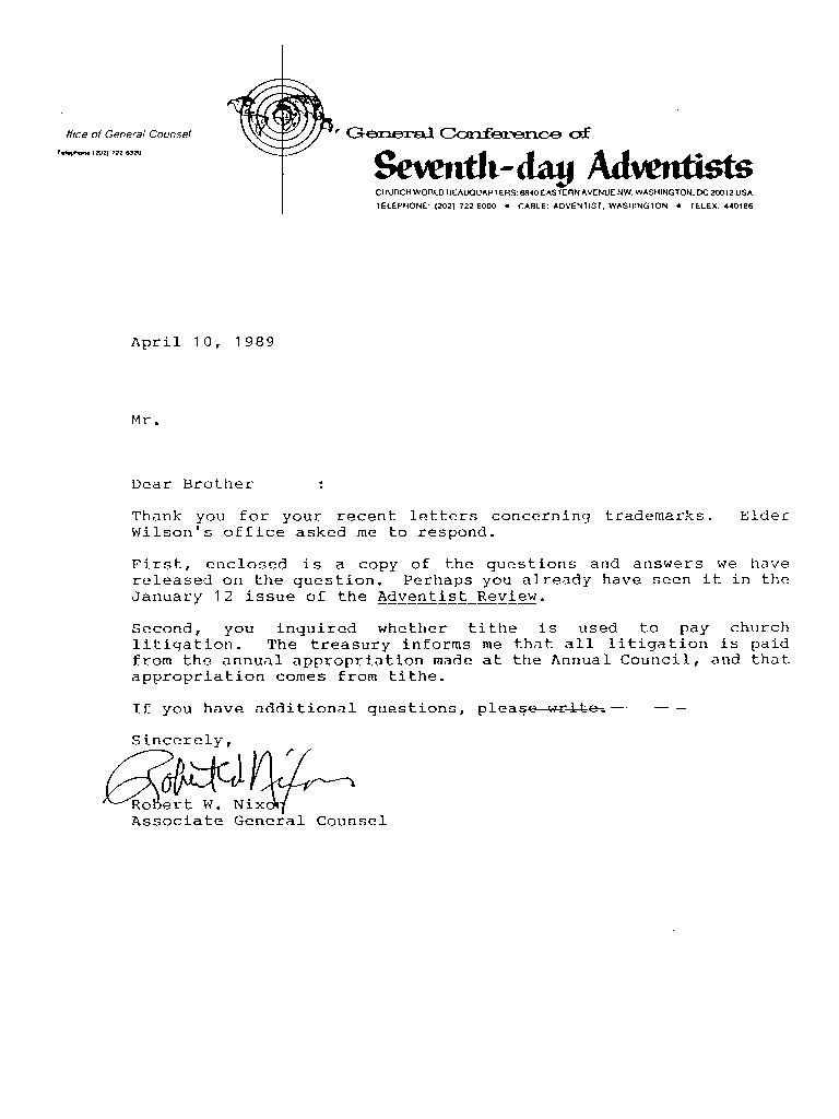 Letter showing the source of funding for the General Conference's legal department: the sacred tithe