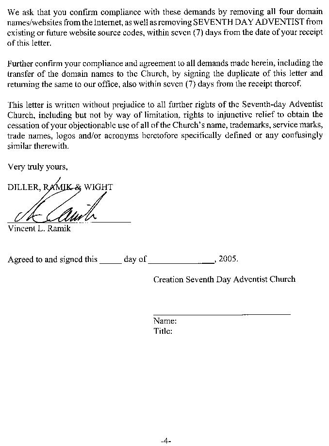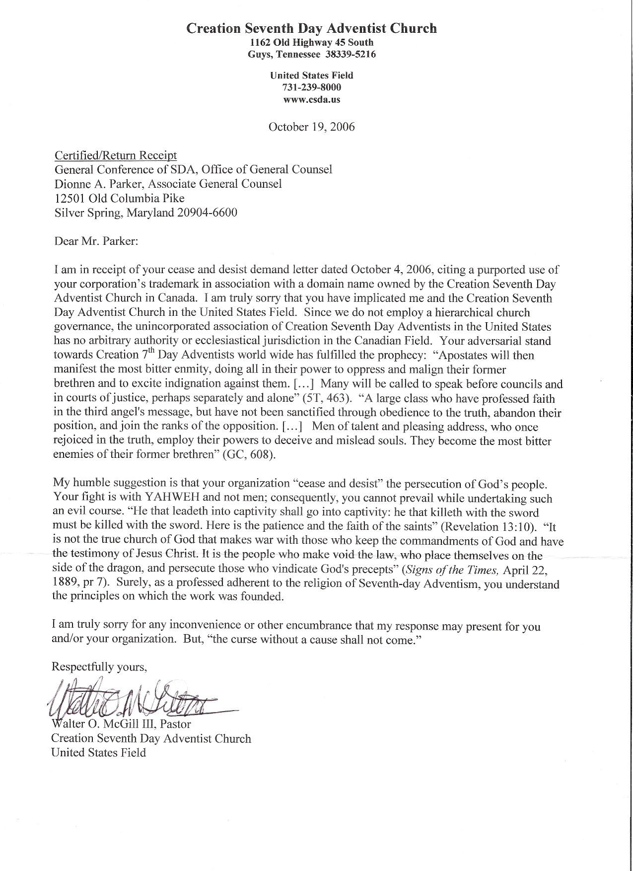 Timeline of Legal Updates (Oldest first) Letter of demand to owner of Davidian SDA domain names:Page 1 Page 2 Page 3 Page 4Update 07/19/05: It has been revealed to us that the General Conference Corporation of Seventh-day Adventists has begun to move forward with their expected legal persecution of the Creation Seventh Day (and) Adventist Church. A letter has been drafted, but not yet received by our members, which follows the same mode of delivery as was undertaken in the above-mentioned letter to the Davidian, and the previous letters of demand that have been sent to various other Adventist believers over time. With prayer, and by the grace of the Almighty, we will stand in the face of this great evil, and witness for the purity of the Faith of our Savior.