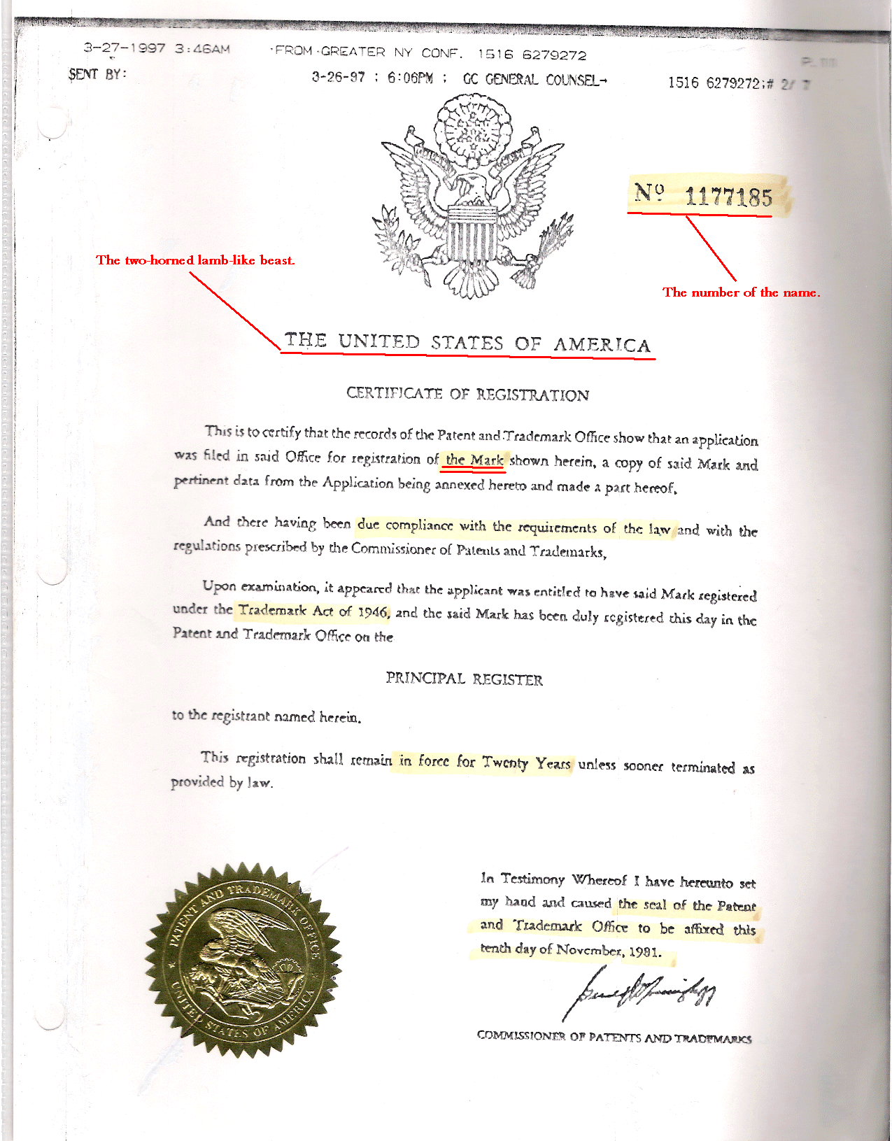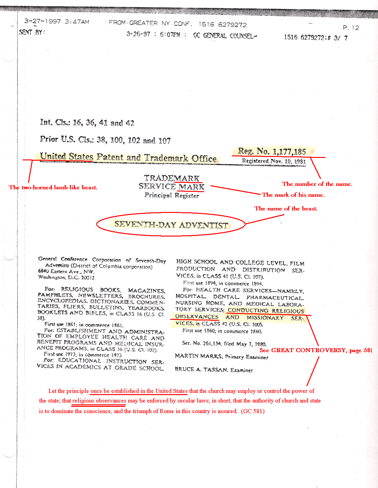 Update 09/27/06:The SDA trademark lawsuit expected for the past 15 years has now begun. The "image of the beast" is imposing "the mark" on the "Remnant Church of Creation 7th Day Adventists." The legal complaint may be viewed by clicking HERE or HERE for printable PDF format. An explanation of our reasons for not yielding the name "SEVENTH DAY ADVENTIST" can be accessed here [Mp4 Video]