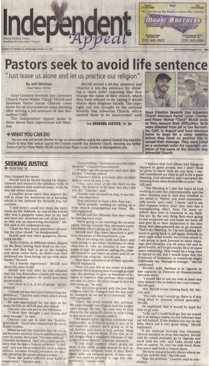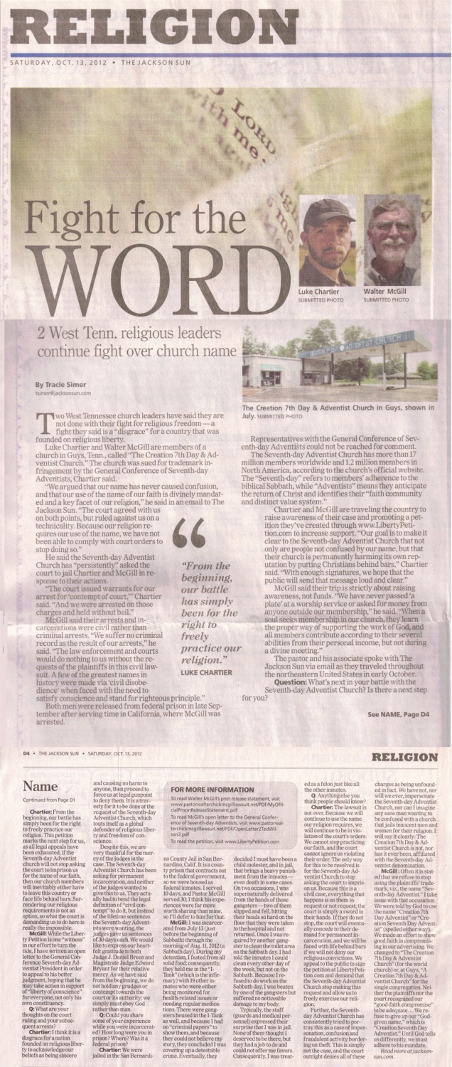 Update 11/14/12: An online petition is launched at LibertyPetition.com protesting the incarcerations and demanding the Seventh-day Adventist Church to cease further legal action. The petition quickly gains traction with the media, and a feature article with an in-depth interview is published by the Jackson Sun. The Independent Appeal publishes it's own interview and coverage of the petition, and Religiousliberty.tv reports on the coverage.