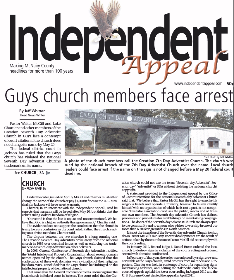 Update 2/11/10: Notice is received from the attorneys for the General Conference that the raid by Federal Marshals on behalf of the General Conference will occur on February 12th at 11:00 am. Advertisements are run in area newspapers for a religious liberty rally on the date to protest the infringement of First Amendment rights. The same day, the General Conference sends notice of the date being changed for undisclosed reasons to the 16th. The date of the rally is likewise altered to the 16th at 9:00 am. ABC News in Jackson, Tennessee covers the impending raid and trademark conflict.