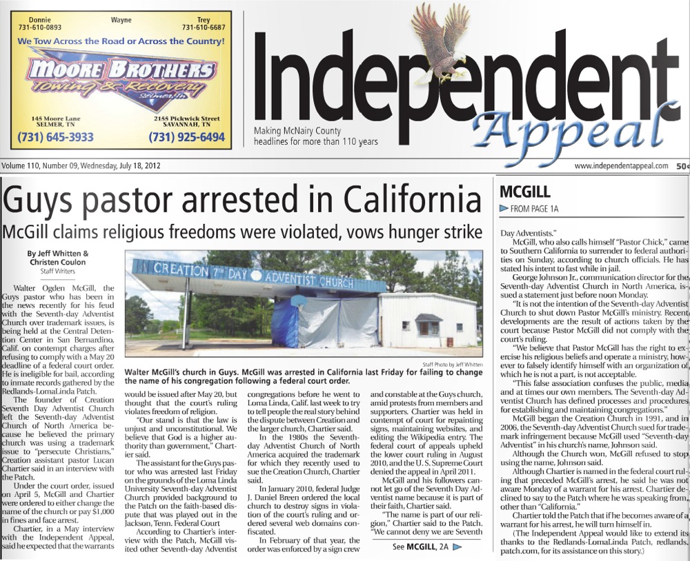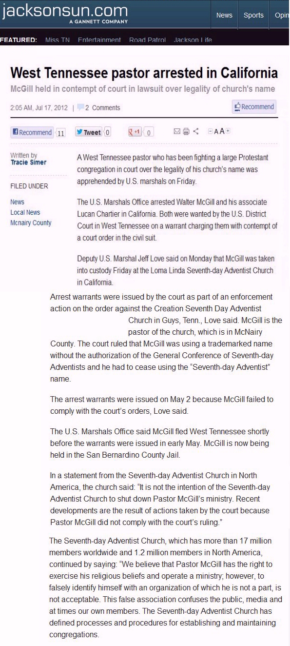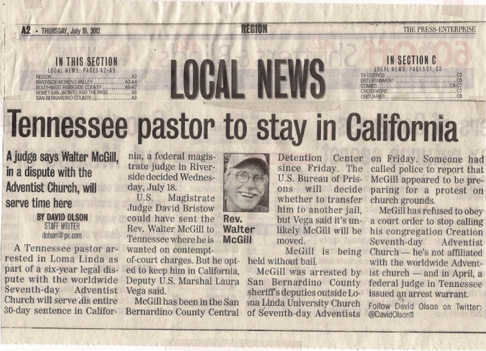 Update 7/14/12: After learning of the issuance of an arrest warrant on the 5th of July, 2012, Pastor McGill makes plans to surrender to the authorities near the campus of Loma Linda University in California following a press conference to be attended by several members of the local and national media. On the evening of Friday, July 13th, two days before the scheduled press conference, Pastor McGill is spotted by Adventist members and immediately taken into custody before he can surrender publicly. Pastor McGill has vowed to fast from solid foods for the duration of his incarceration. The arrest is covered by several media outlets, including the Press Enterprise, the Redlands-Loma Linda Patch, two articles (1 2) by the Jackson Sun, the Independant Appeal, CBS News in Memphis and ABC News in Jackson. Blog coverage is offered by Spectrum Magazine, Religiousliberty.tv, and Adventist Today with follow-up stories from Press Enterprise, ABC News, and the Redlands-Loma Linda Patch regarding the details of the arrest and sentence.