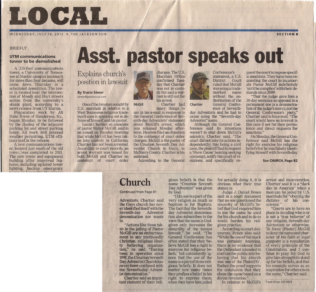 Update 6/26/10: The report and recommendation to Judge Breen is filed by Magistrate Judge Bryant. Recommending that the Court find both Mr. Chartier and Pastor McGill in contempt, the Judge takes opportunity to give several observations regarding his perceptions, many of which are blatently inaccurate and/or condescending. Among other statements, the Judge commends Mr. Chartier for his sincerity and knowledge then proceeds to dismiss him as a misguided and inexperienced youth. He further reports that the Defendant took the name arbitrarily (despite a prior Court acknowledgment that it was based on Divine revelation), that they seized a property right (despite religious identity being an entirely different matter from property), and that they are creating confusion to the detriment of the General Conference (despite no evidence of such ever having been presented).