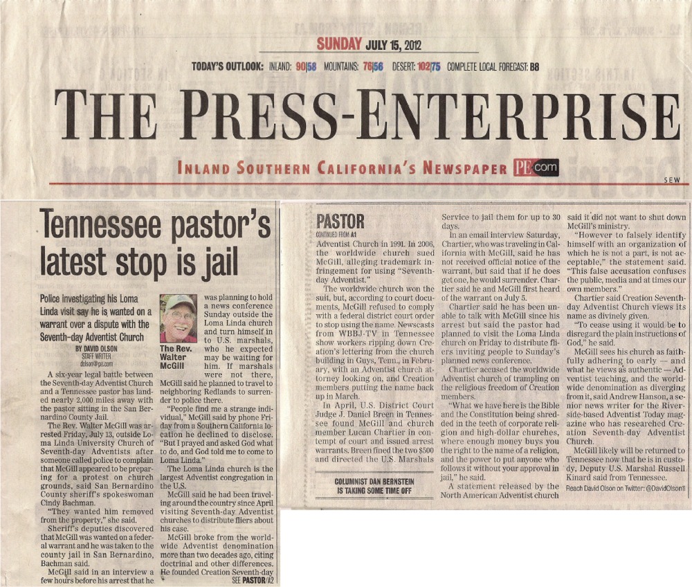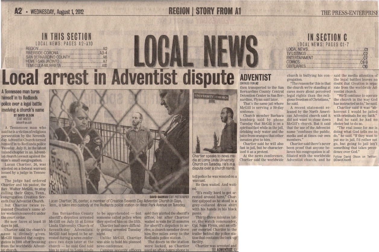 Update 7/31/12: Following a 20-minute press conference, during which time he was able to deliver a statement to several members of the media, Bro. Chartier submitted himself to the authorities, and was incarcerated for an anticipated period of 10 days. He has vowed to fast as a protest for this violation of his religious liberty, and as a show of support for Pastor McGill. The conference and arrest are covered by the Press Enterprise, Redlands Loma-Linda Patch, and ABC 7 News. Blog coverage is offered by Spectrum Magazine and Adventist Today.