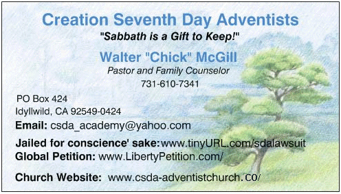 I will take leave from my testimony briefly here to insert a more thorough explanation of my "mental illness." In 1974 following my conversion to the Seventh-day Adventist faith, I was diagnosed at Peninsula Center in Louisville, TN as having "manic-depressive disorder" which is the same affliction as what is commonly called "bipolar disease." I did not take medications, however, because of my new experience with Seventh-day Adventism and the counsels of Ellen G. White against the use of toxic drugs. My condition worsened with time, as my "conversion" was not genuine. It may be noted here that in 2004 I submitted myself to a battery of psychological tests at the VA Medical Center in Memphis, TN. The doctor in charge of my case was Dr. Bethany Spiller, and she was amazed at my condition. She said that I exhibited no signs of mental imbalance or effects of bipolar disease. I told her that I attributed my healing to a genuine conversion experience in June of 1988. Dr. Spiller was so "intrigued" with my experience and success that she invited me to give my testimony at a "social services department workshop" that she facilitated. As I spent 20 minutes telling my story, one could see expressions of various emotions upon the faces of those in the room full of psychologists, psychiatrists, and social workers. At the close of the meeting, Dr. spiller debriefed with me, and as she had tears in her eyes, she said, "Science does not explain what you have experienced." All praises be to God!