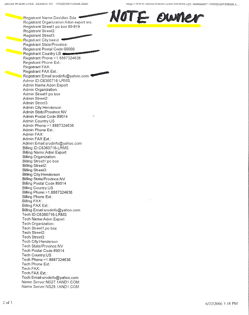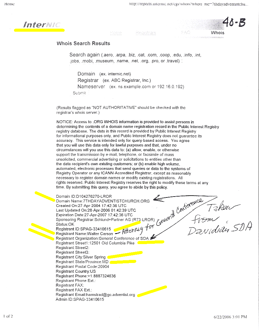 Database search for 7THDAYADVENTIST.INFO-- It is noted here that the owner of this domain name reamains as DavidianSDA.org with the creation date of April 27, 2004.