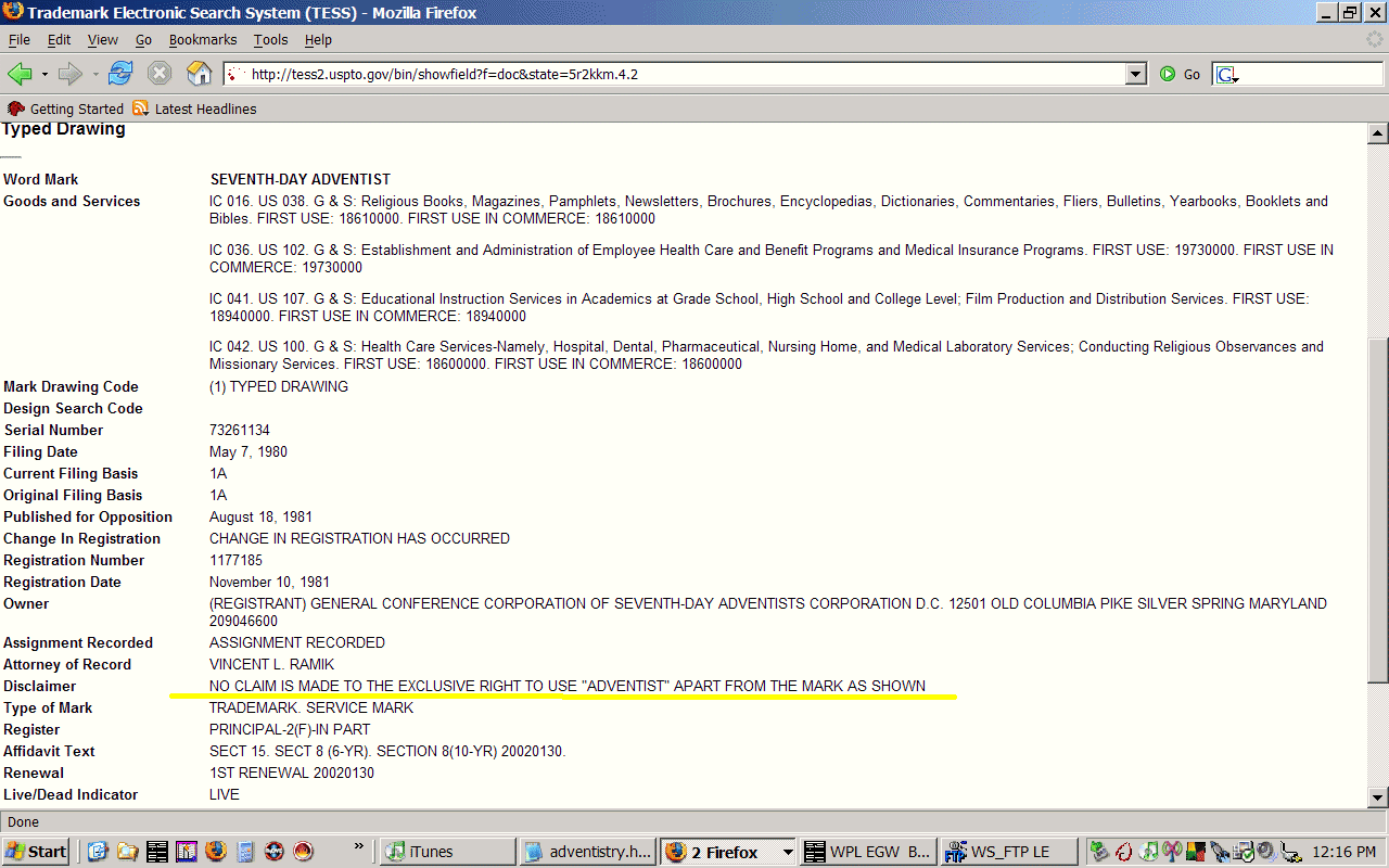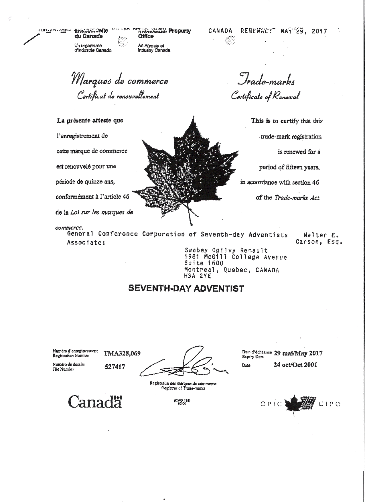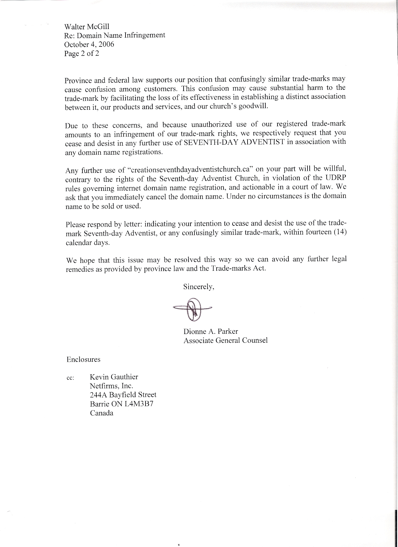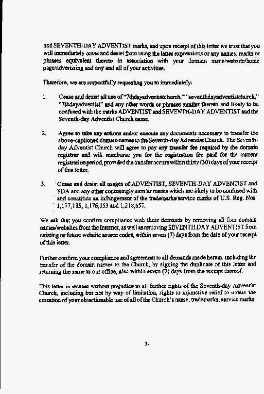 Update 10/10/06: The General Conference of SDA is now threatening Pastor "Chick" with a demand letter regarding a CSDA domain name in Canada. See images of the letter and Canadian trademark documents following: