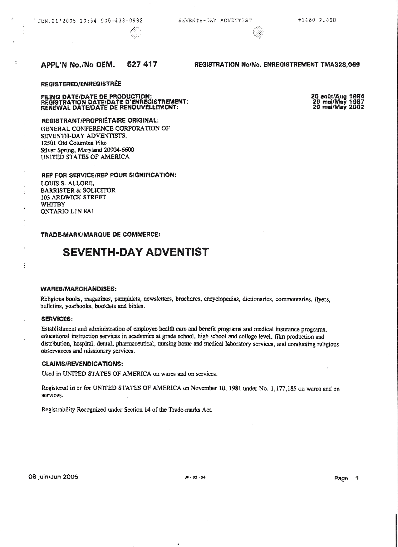 Update 06/16/08: An order granting in part and denying in part [pdf][doc] the General Conference's motion for a summary judgment was issued on June 11, 2008. The trademarked name "Seventh day Adventist" was upheld by the judge's decision. A complete victory was denied the Conference, however, regarding the words "SDA and "Adventist." As more information about what this decision means for the CSDA movement becomes available, we will update this page.
