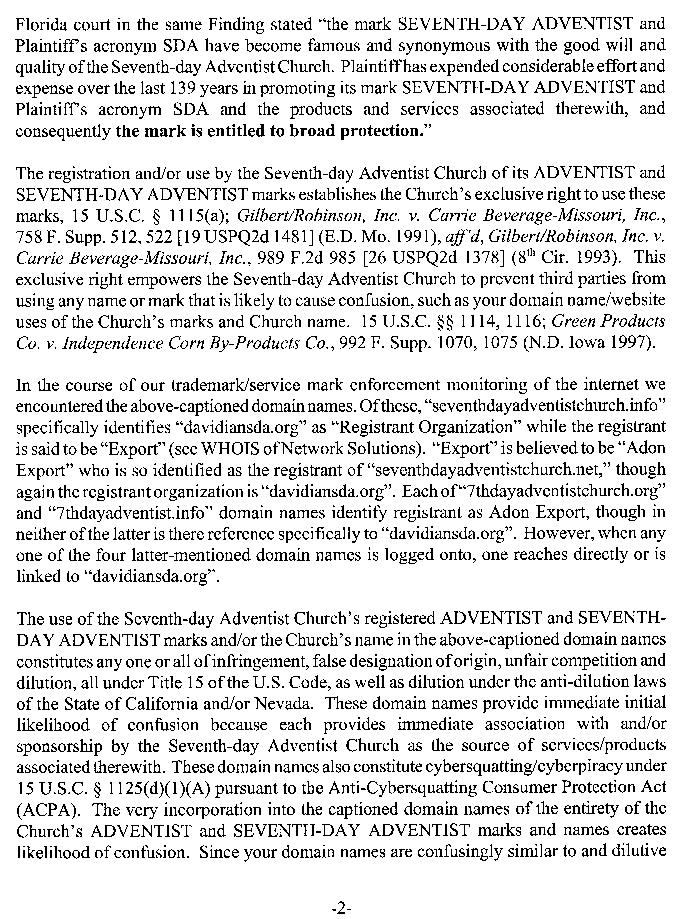 Obviously, the General Conference of SDA has negotiated a settlement with the owner of DavidianSDA.org. Interestingly, though the General Conference allows DavidianSDA.org to continue use of 7THDAYADVENTIST.INFO, the attorneys representing the General Conference are seeking to have 7TH-DAY-ADVENTIST.ORG transferred from Pastor McGill to the General Conference of SDA.