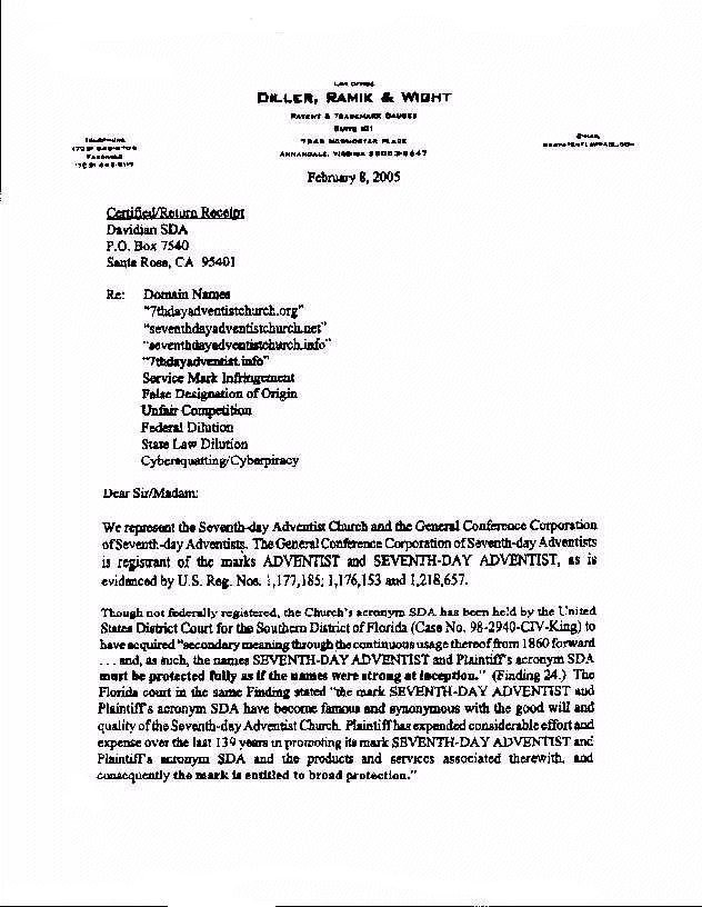 Update 05/27/06: We have received notice that the General Conference Corporation of SDAs is now threatening our internet domain names on the world scale. Pastor "Chick" has received email notification that the World Intellectual Property Organization (WIPO) Arbitration and Mediation Center has received a complaint against several of our websites, this complaint being dated at May 23rd of this year.