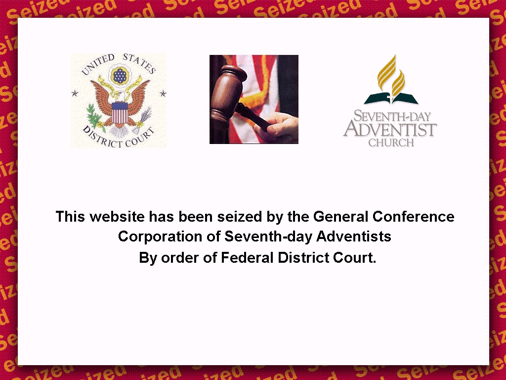 Update 07/19/05: It has been revealed to us that the General Conference Corporation of Seventh-day Adventists has begun to move forward with their expected legal persecution of the Creation Seventh Day Adventist Church. A letter has been drafted, but not yet received by our members, which follows the same mode of delivery as was undertaken in the above-mentioned letter to the Davidian, and the previous letters of demand that have been sent to various other Adventist believers over time. With prayer, and by the grace of the Almighty, we will stand in the face of this great evil, and witness for the purity of the Faith of our Savior.