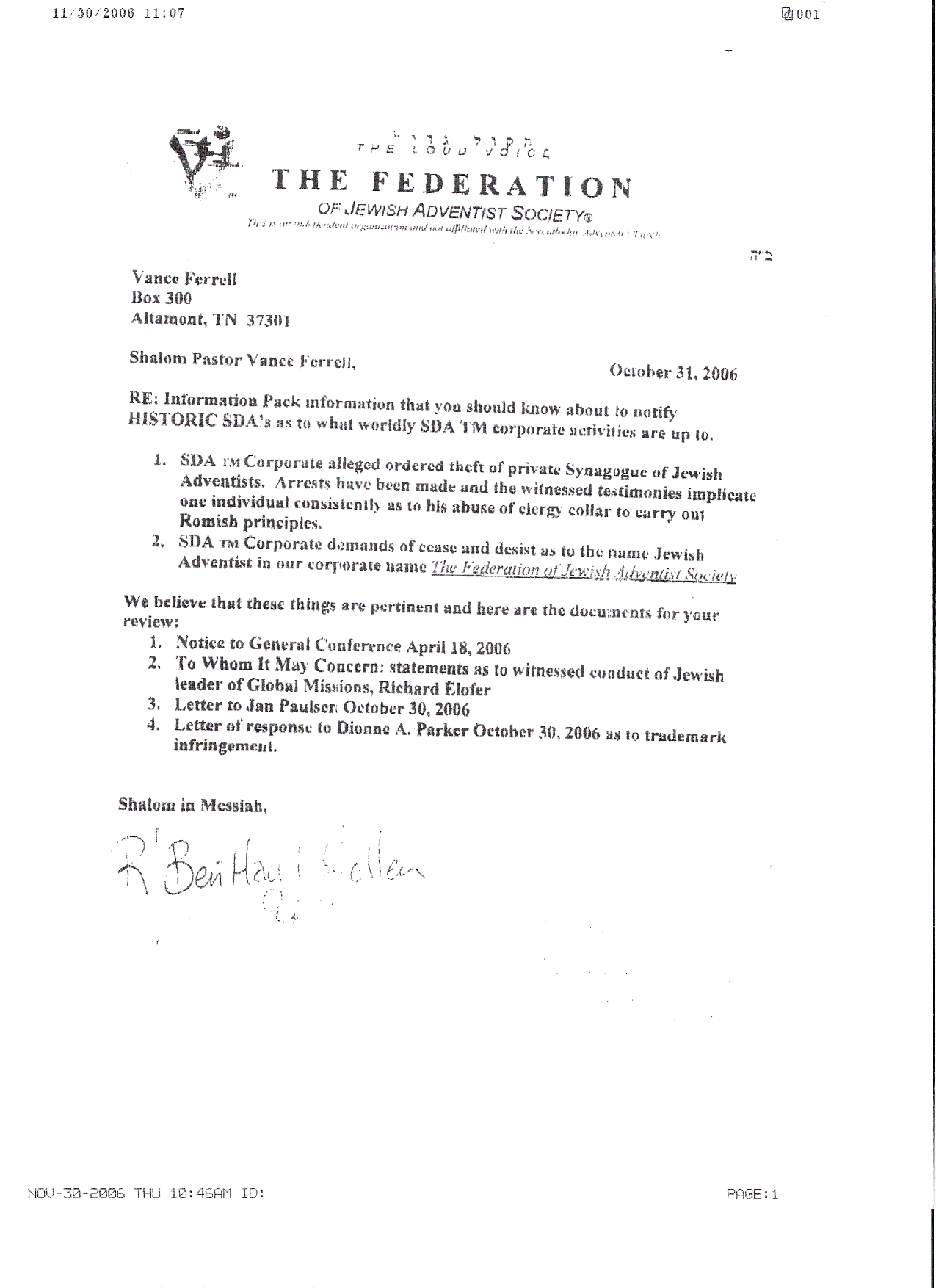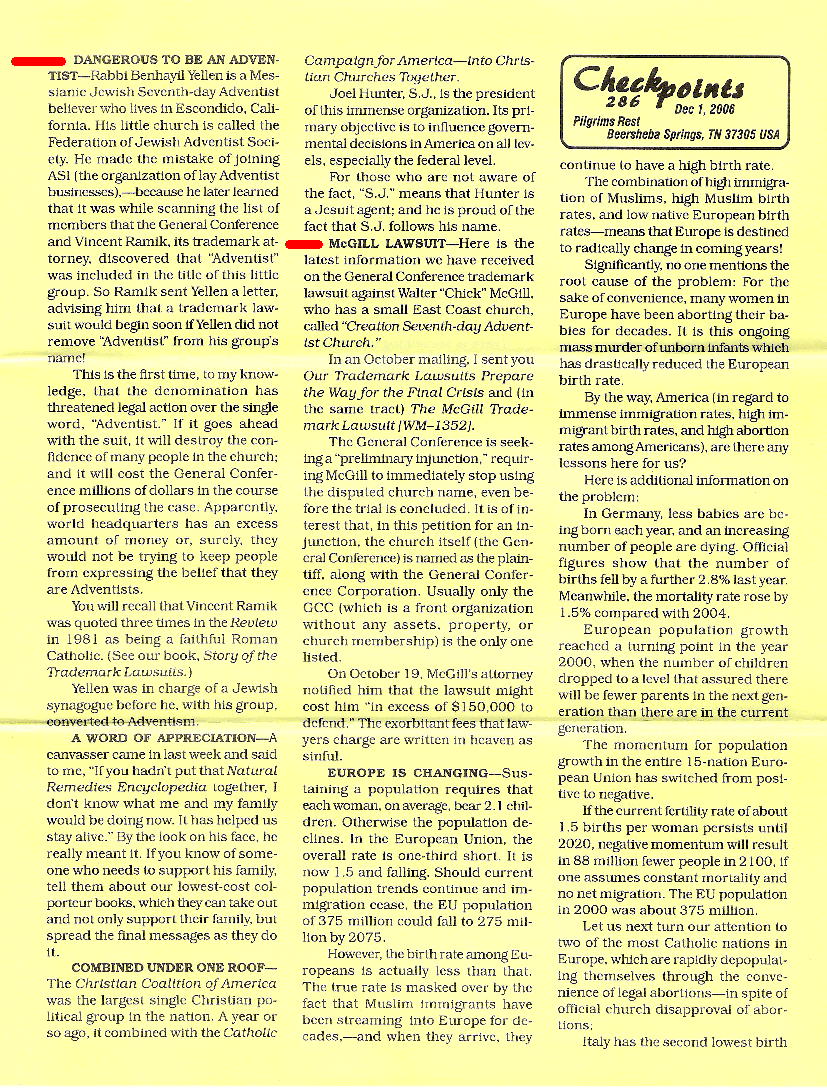 Update 03/25/07: A two-page letter has been sent out to a large number of Adventists to inform them of the Trademark lawsuit, of which most are unaware. Positive responses have already begun to be received as a result of this information.